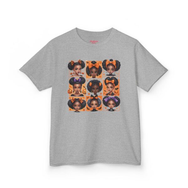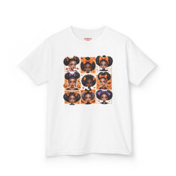 Celebrate spooky season in the cutest way possible with this Spooky Cute Halloween Girls T-Shirt! Featuring a 3×3 grid of stylish African American girls with natural hair, bold bows, and festive pumpkin and bat backgrounds, this tee is perfect for kids, tweens, and anyone who loves fun fall fashion.